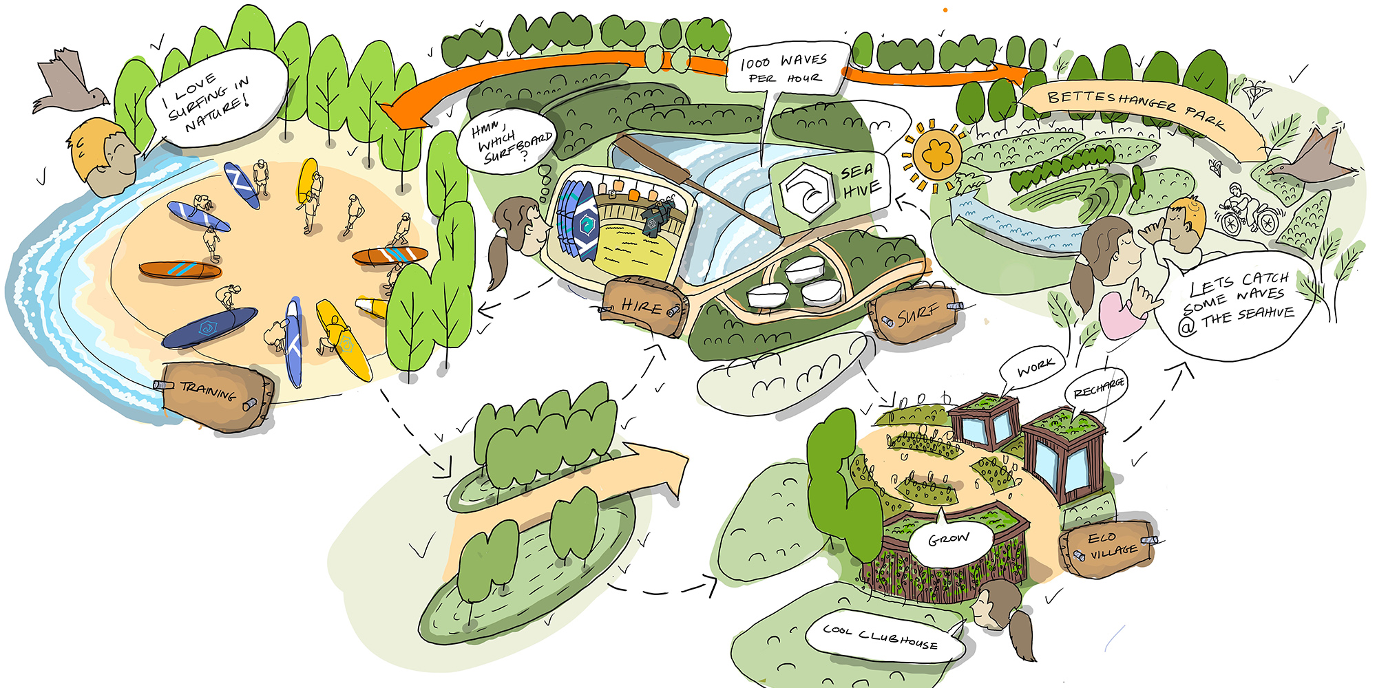 Surfing tourism is an exciting and emerging leisure sector across the world. We were thrilled to be appointed as the Landscape Architects on the project and commissioned to undertake the LVIA, landscape strategy report, and the landscape architectural design for the development of a surfing-centred leisure and tourism facility hub, The The Sea Hive’ in Betteshanger Country Park in Kent.