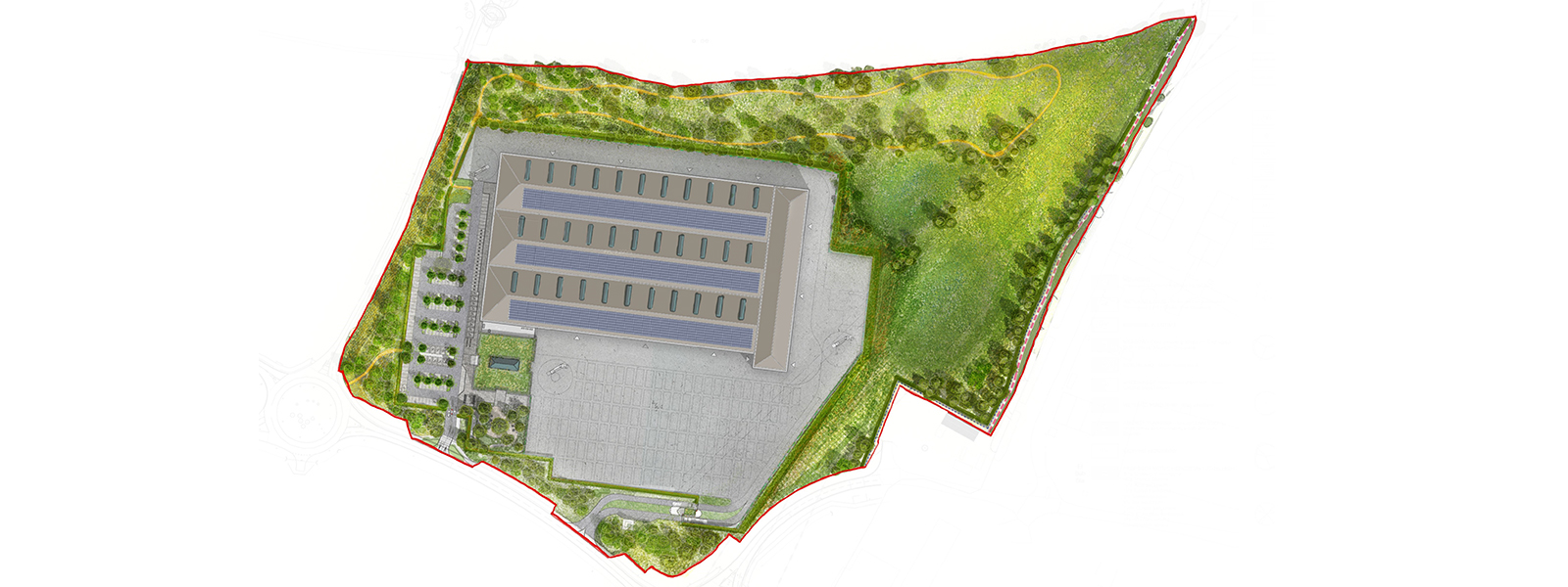 The landscape proposal creates naturalistic boundary treatments with extensive ecological benefit to the local area, as well as providing visual mitigation from the proposed internal use of the Site and to provide amenity benefit to the workers within the factory.